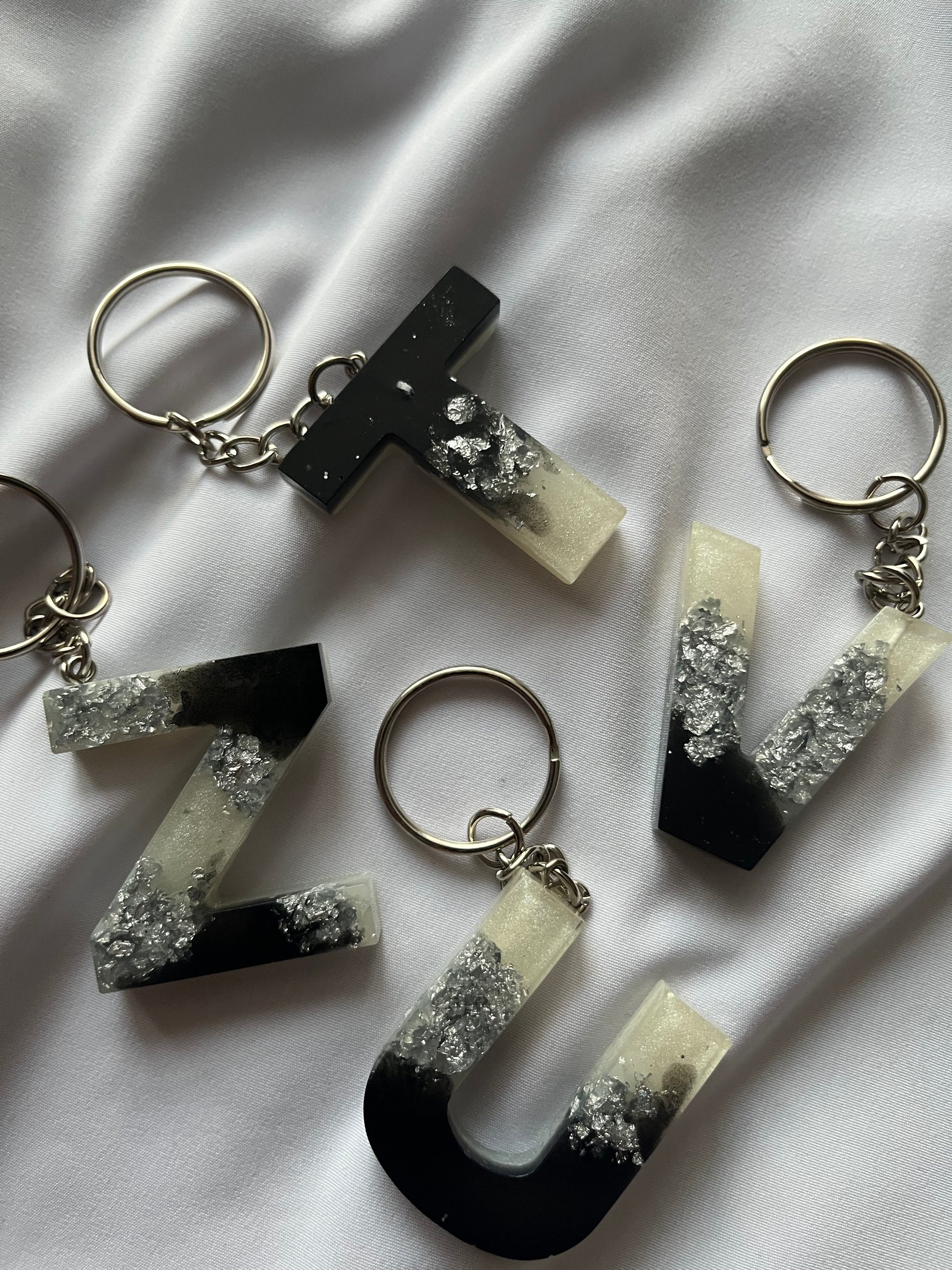 These resin letter keyrings feature a smooth blend of black and white tones with shimmering silver flakes. Their clean, modern finish makes them a stylish and eye-catching accessory for everyday use.