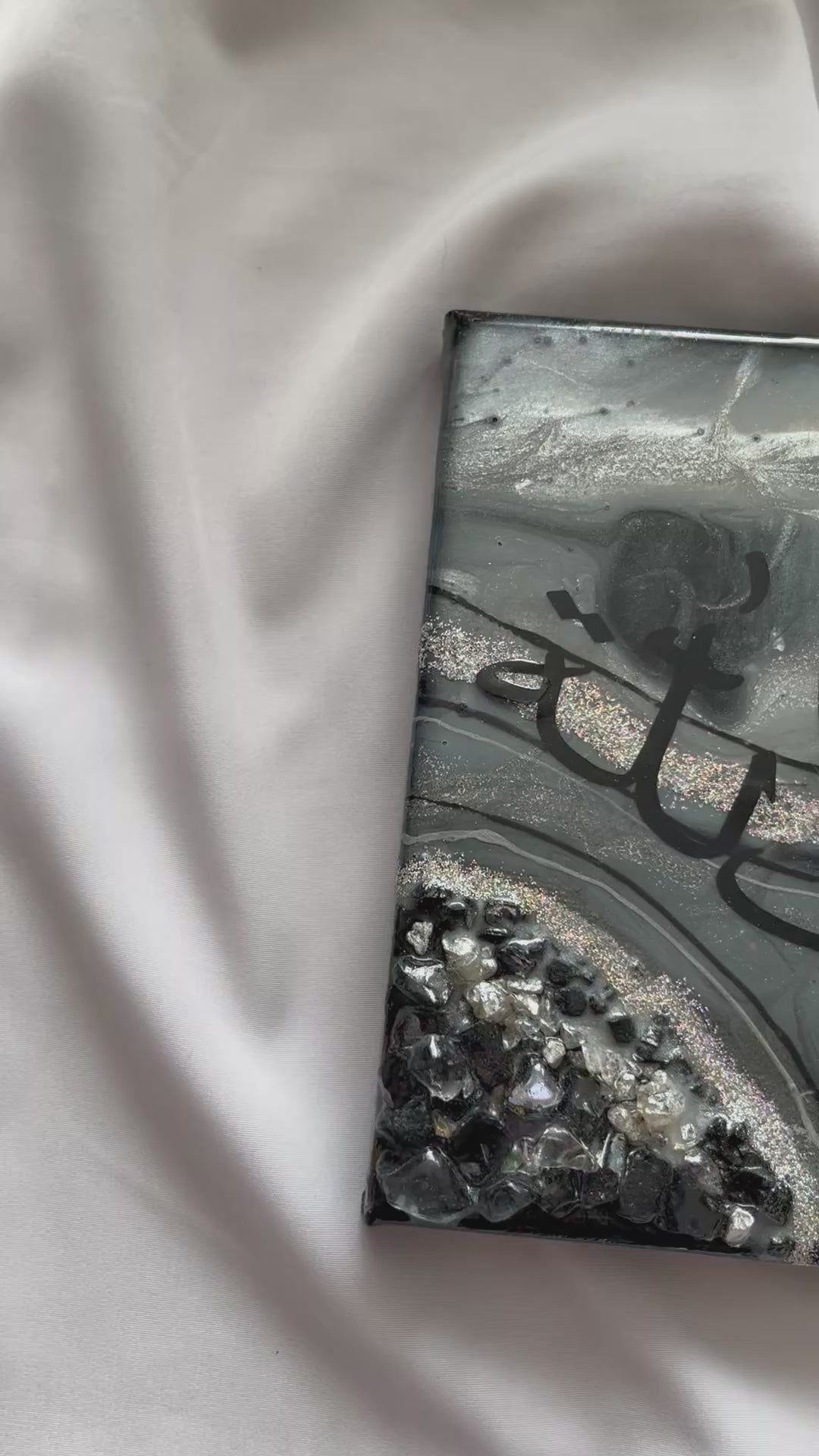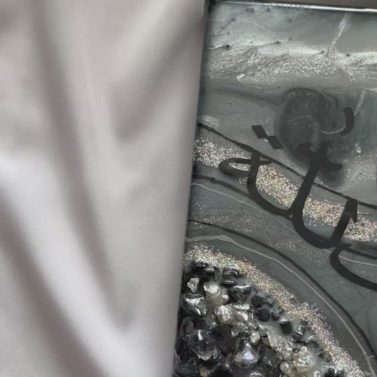 A premium black-and-silver geode resin canvas featuring elegant Arabic calligraphy of “Alhamdulillah.” Crafted with shimmering crystals, deep black tones, and a flawless high-gloss finish.