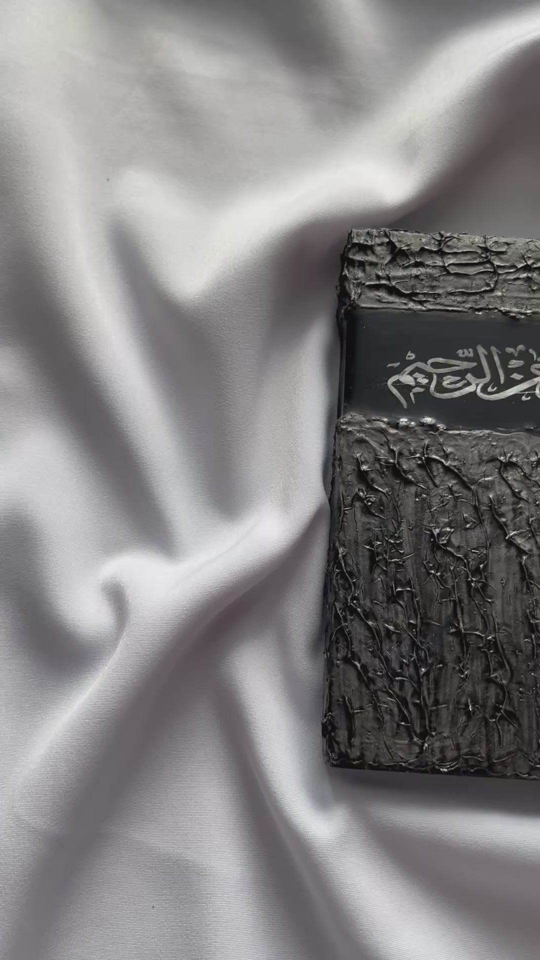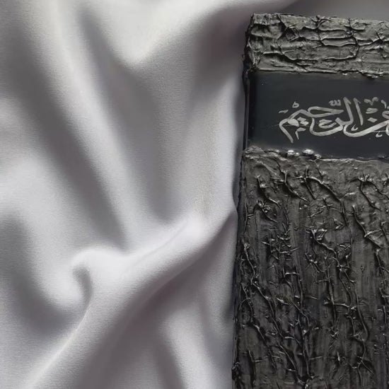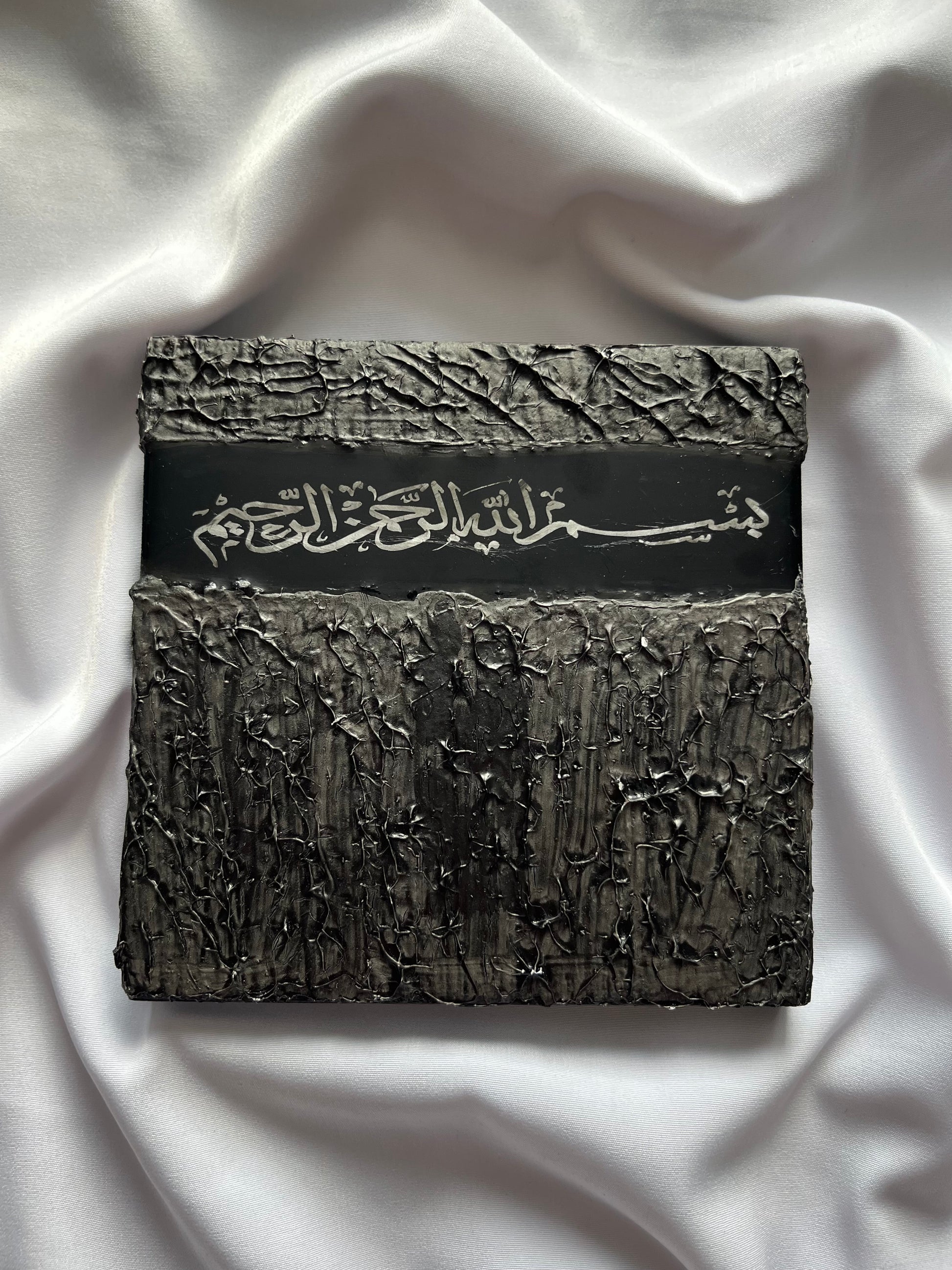 A black textured resin canvas featuring Arabic calligraphy . Designed with a raised textured finish on the top and bottom.