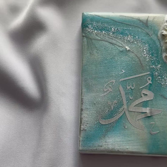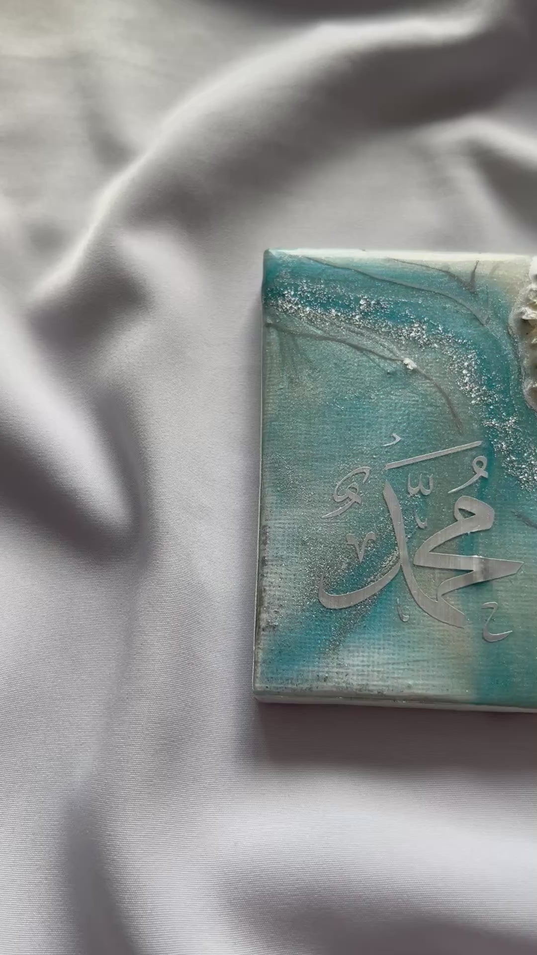 A refined blue resin artwork featuring elegant Arabic calligraphy, shimmering crystal accents, and soft metallic details. Hand-crafted with a smooth, luxurious finish.