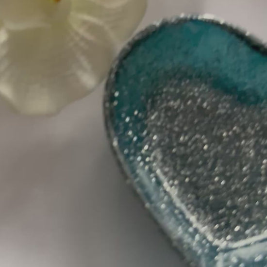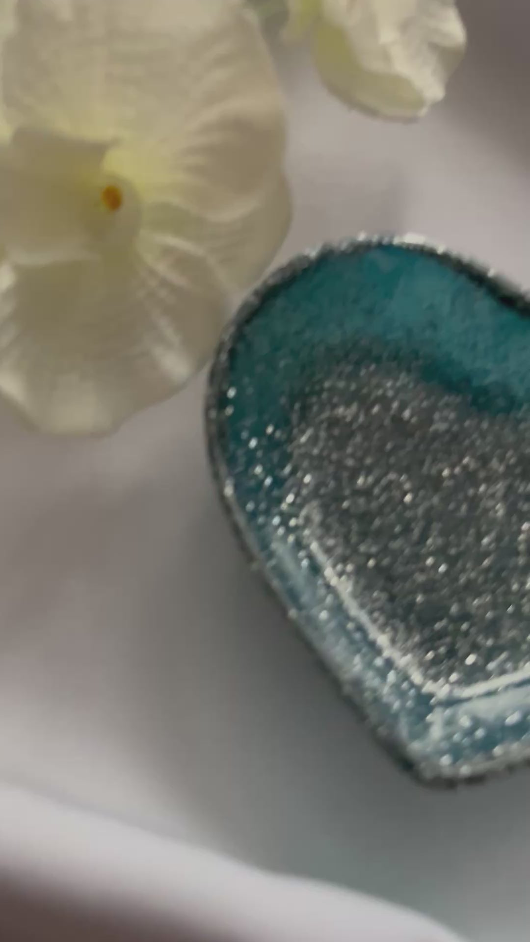 A handcrafted blue resin heart dish with a soft, pearlescent shine. Perfect for holding jewellery, keys, or small keepsakes.