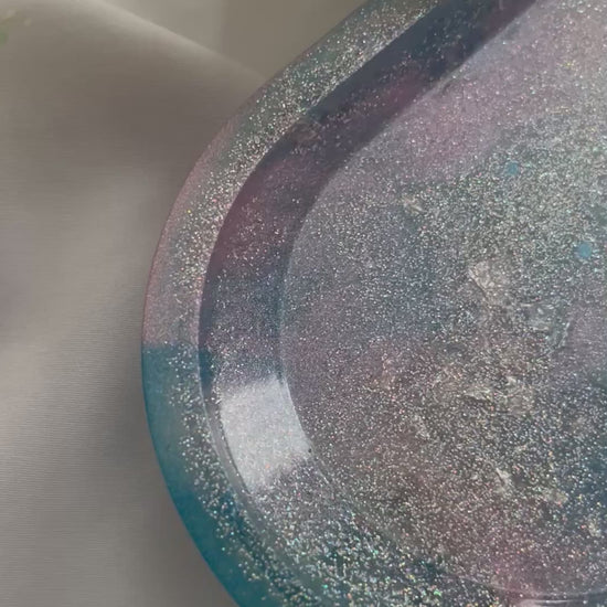 A sweet pastel Bubblegum Oval Tray made with pink and blue resin swirls and a touch of sparkle. Perfect for holding jewellery, keys, candles, or small décor.