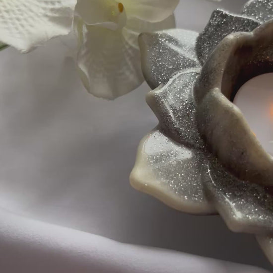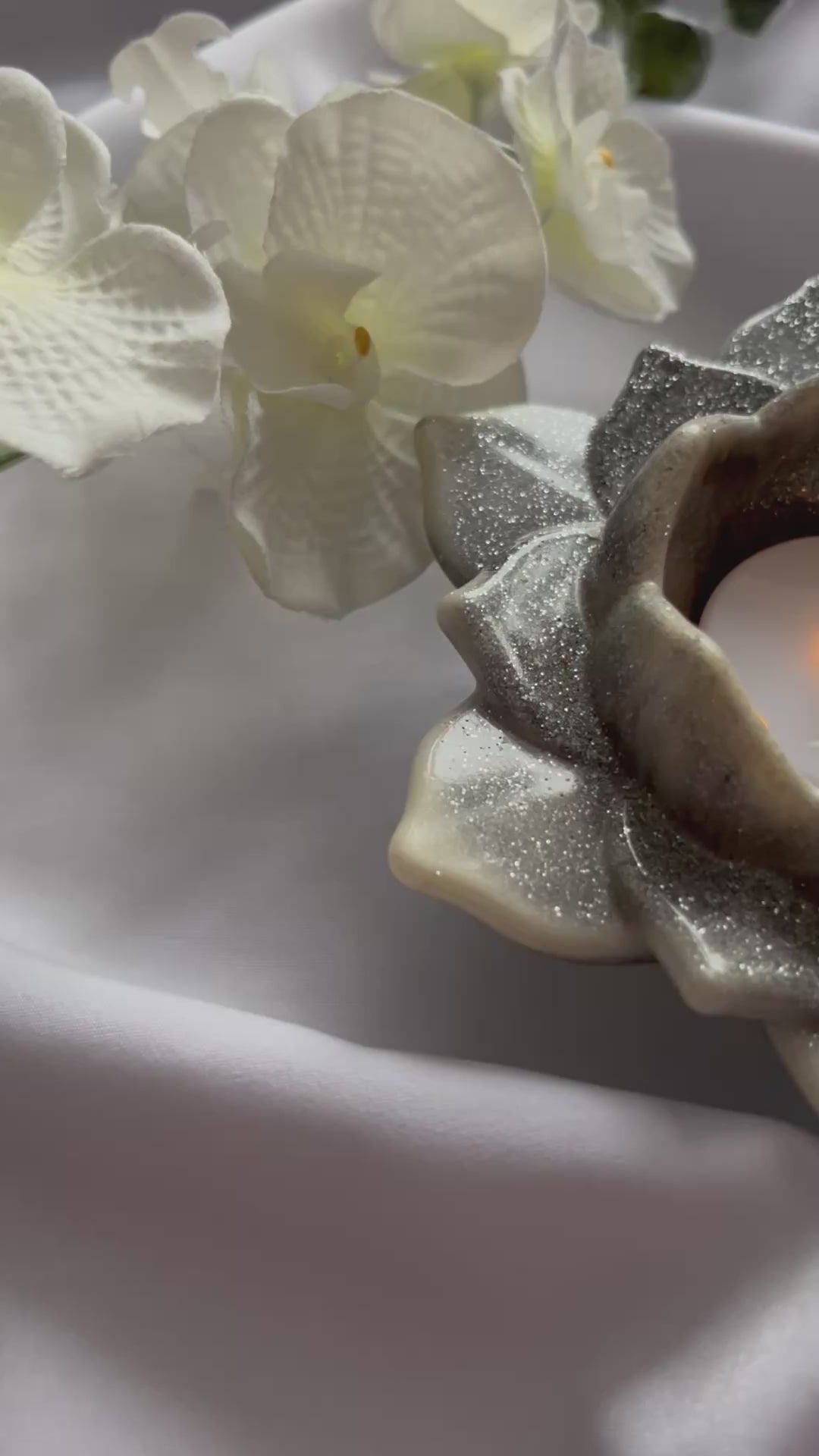 The Charcoal Lotus Candle Holder features a smooth gradient of deep charcoal and soft grey tones, finished with a subtle silver shimmer. Designed in a layered lotus shape, it brings a calm and modern touch to any space. Perfect for tealights or small candles.