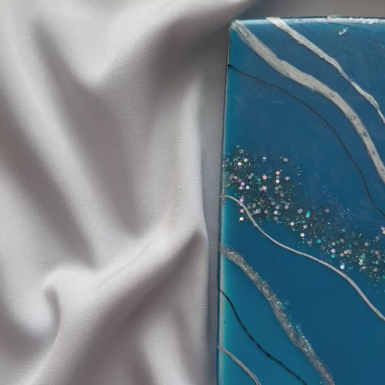 A bold, luxury resin canvas in rich, deep-blue tones, lined with flowing metallic accents and shimmering crystal textures
