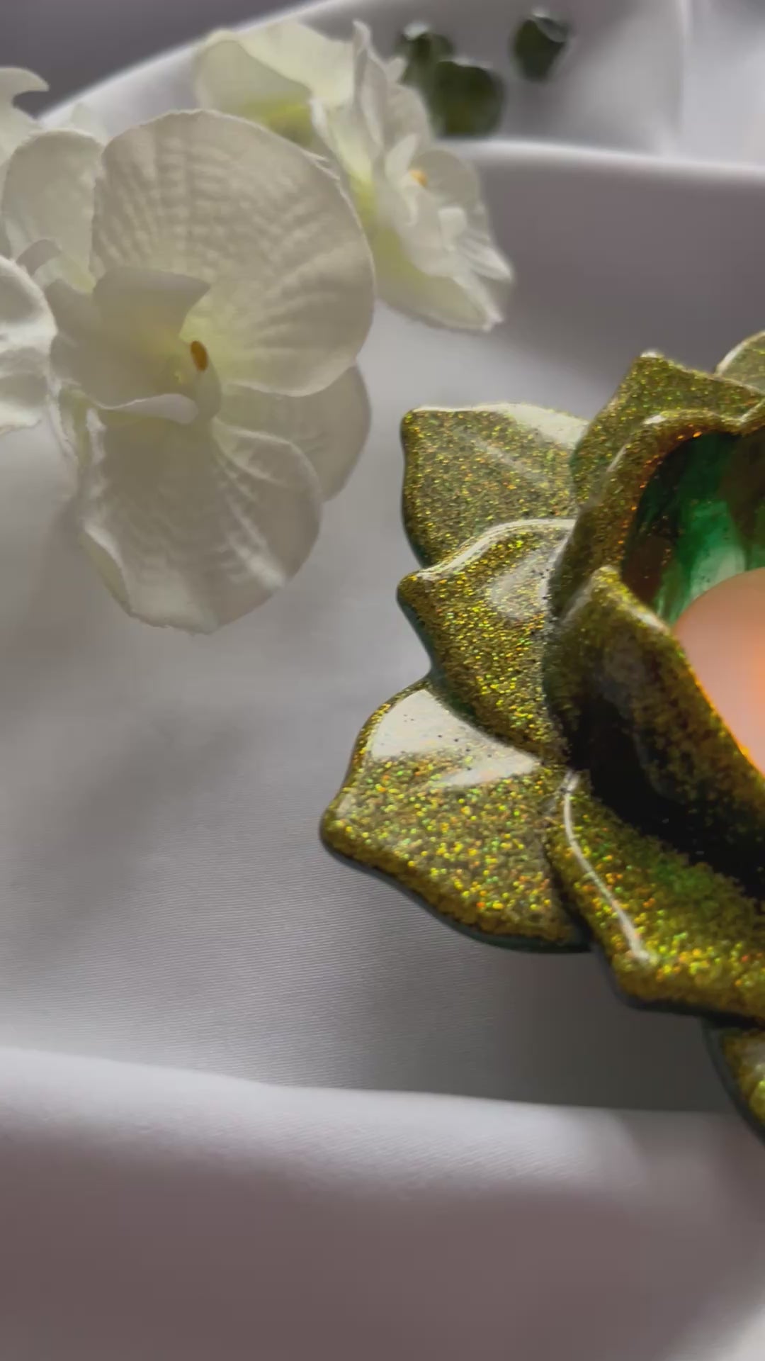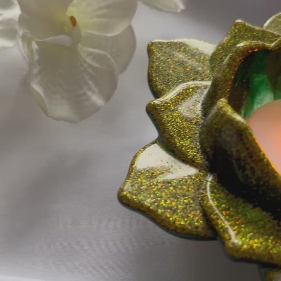 A vibrant resin lotus candle holder crafted with rich green and gold glitter.Ideal for tealights and LED candles.