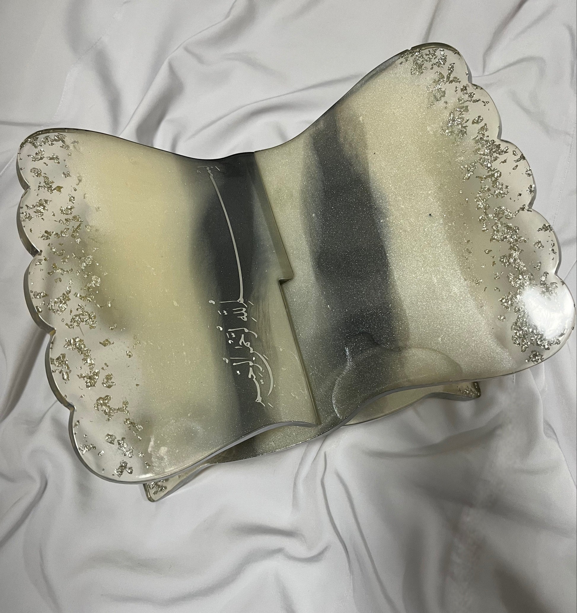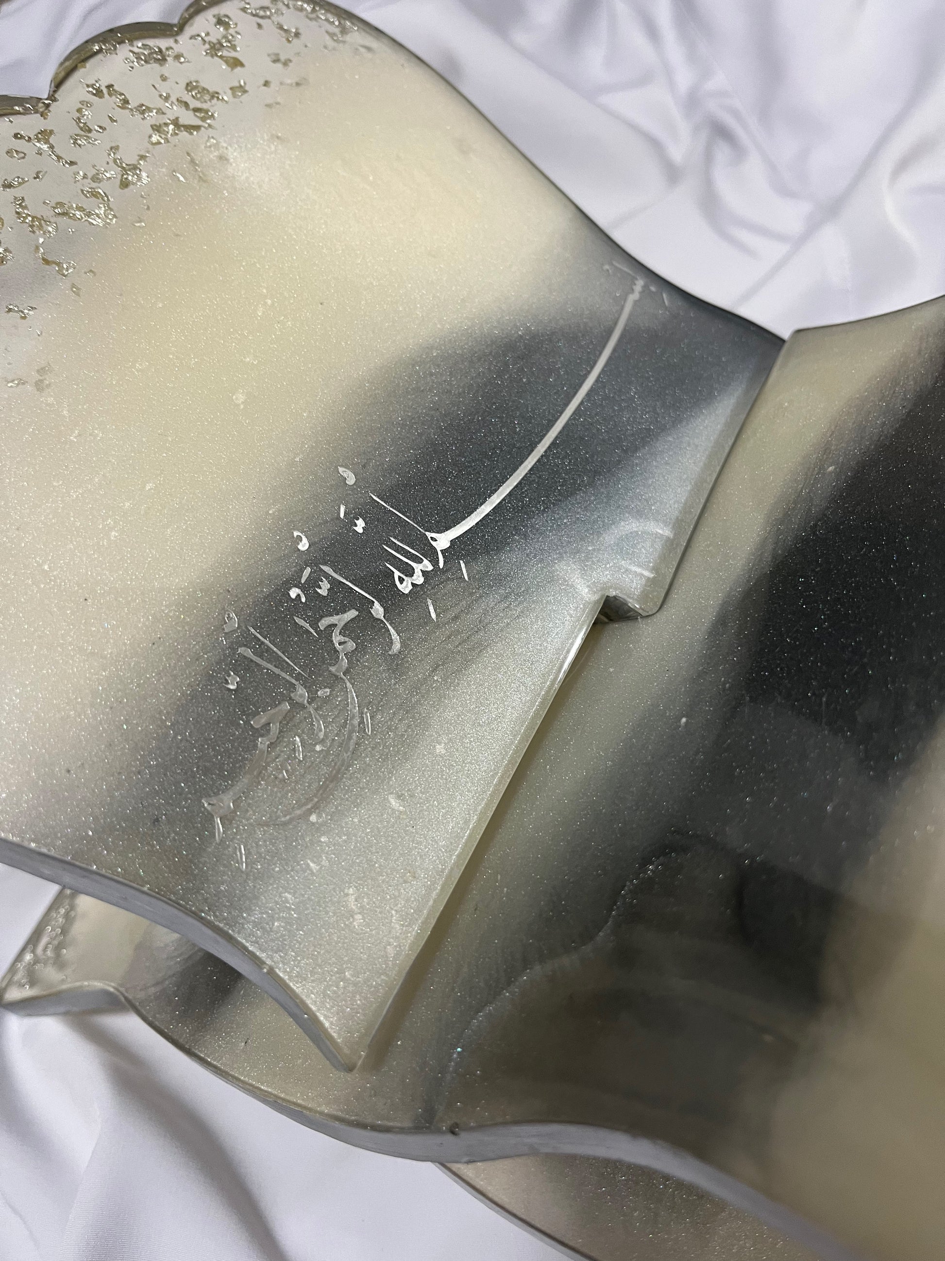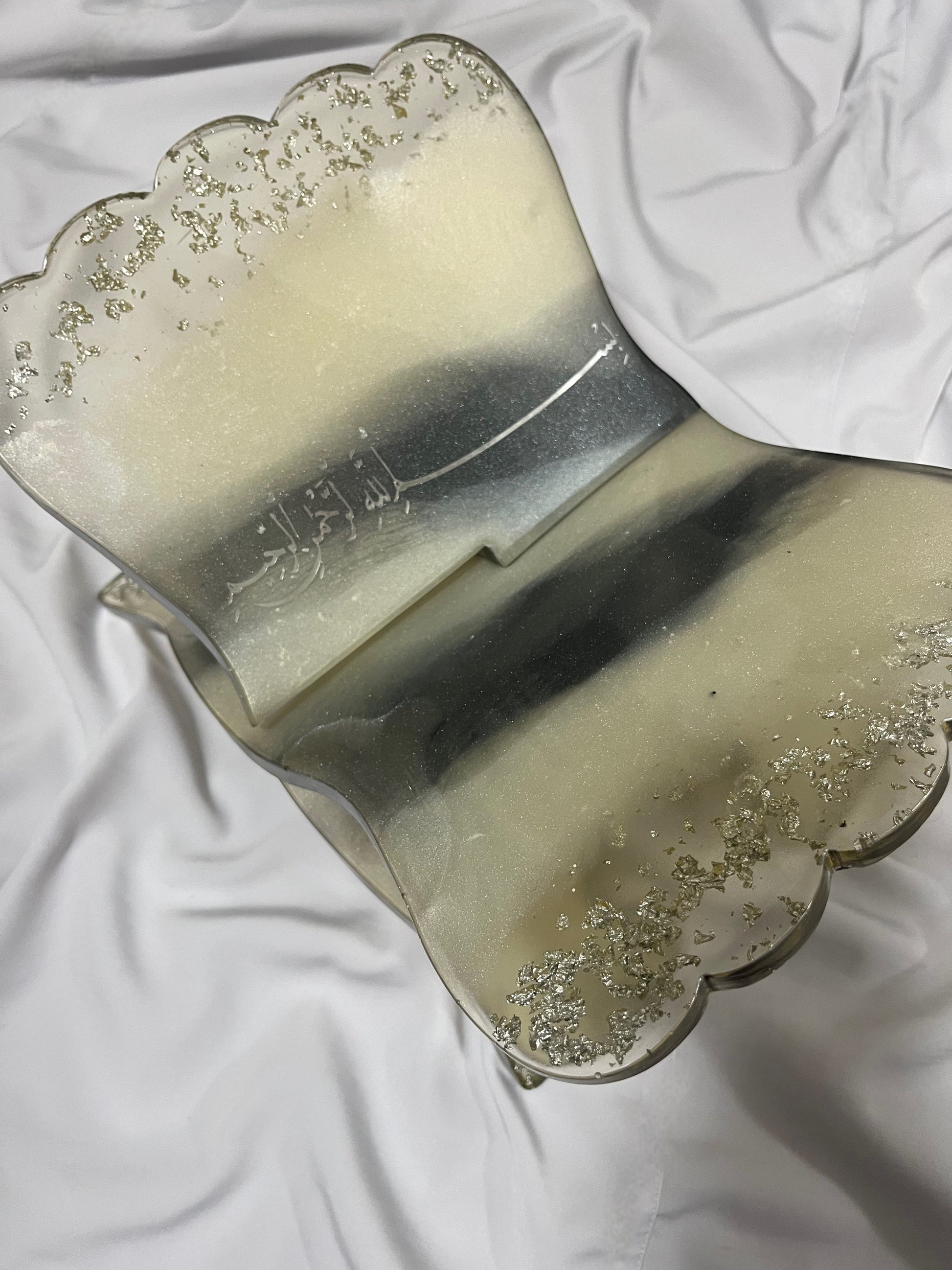 This beautifully crafted cream-grey Qur’an stand features a serene, minimalist design accented with the sacred phrase Bismillah ir-Rahman ir-Raheem delicately inscribed in Arabic. Its smooth finish and sturdy build make it perfect for holding the Qur’an during recitation, while adding a graceful spiritual touch to any prayer space.