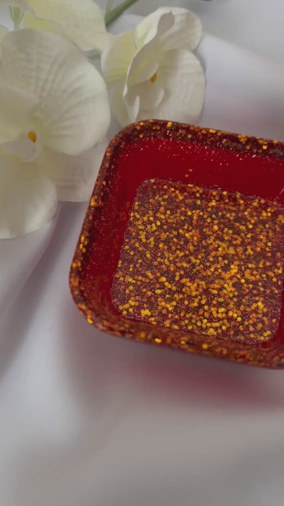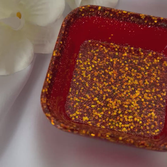 A vibrant resin dish infused with fiery glitter that catches the light beautifully. Compact, bold, and ideal for holding jewellery, keys, or small essentials with a touch of glamour.