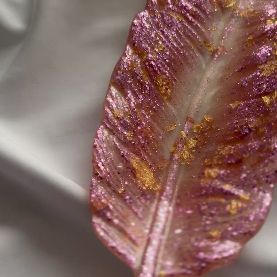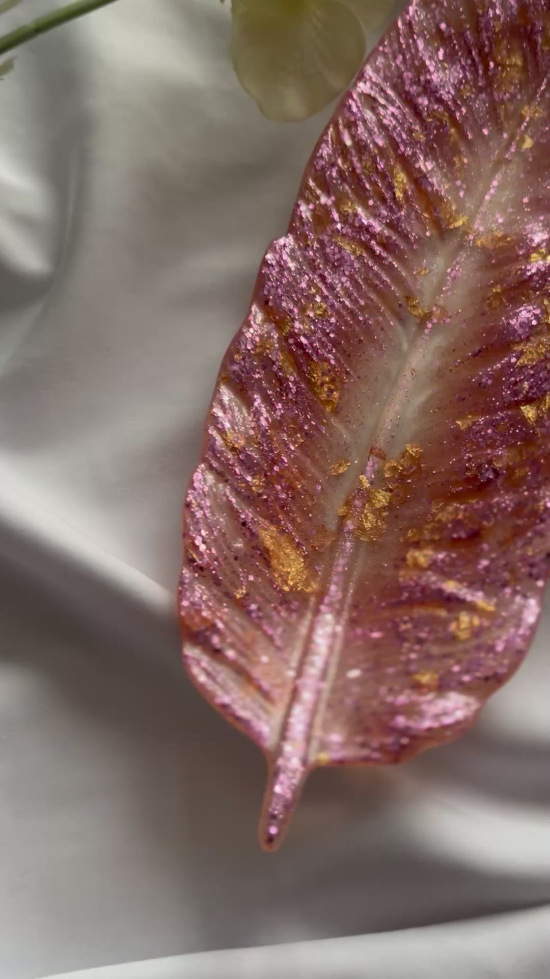 Bring a soft, luminous glow to your decor with our Rosé feather Tray. Handcrafted from premium resin, this elegant tray showcases blush-pink hues infused with shimmering glitter and golden leaf accents. Its graceful feather shape and high-gloss finish catch the light beautifully, making it ideal for displaying jewellery, perfumes, or candles with a refined, radiant charm.