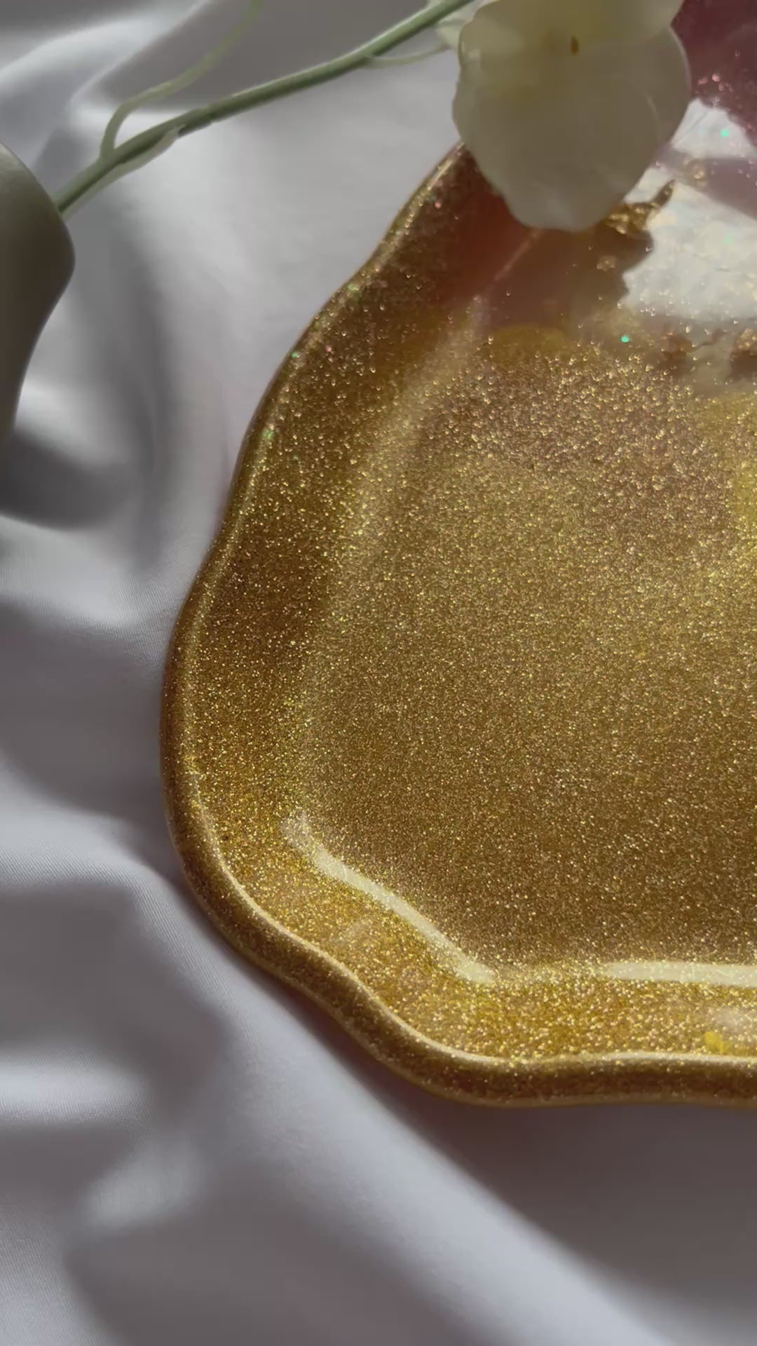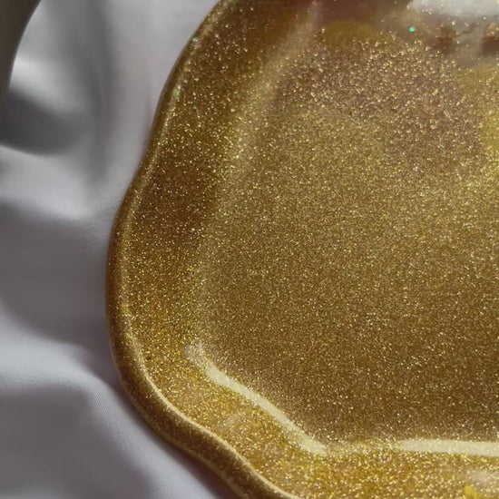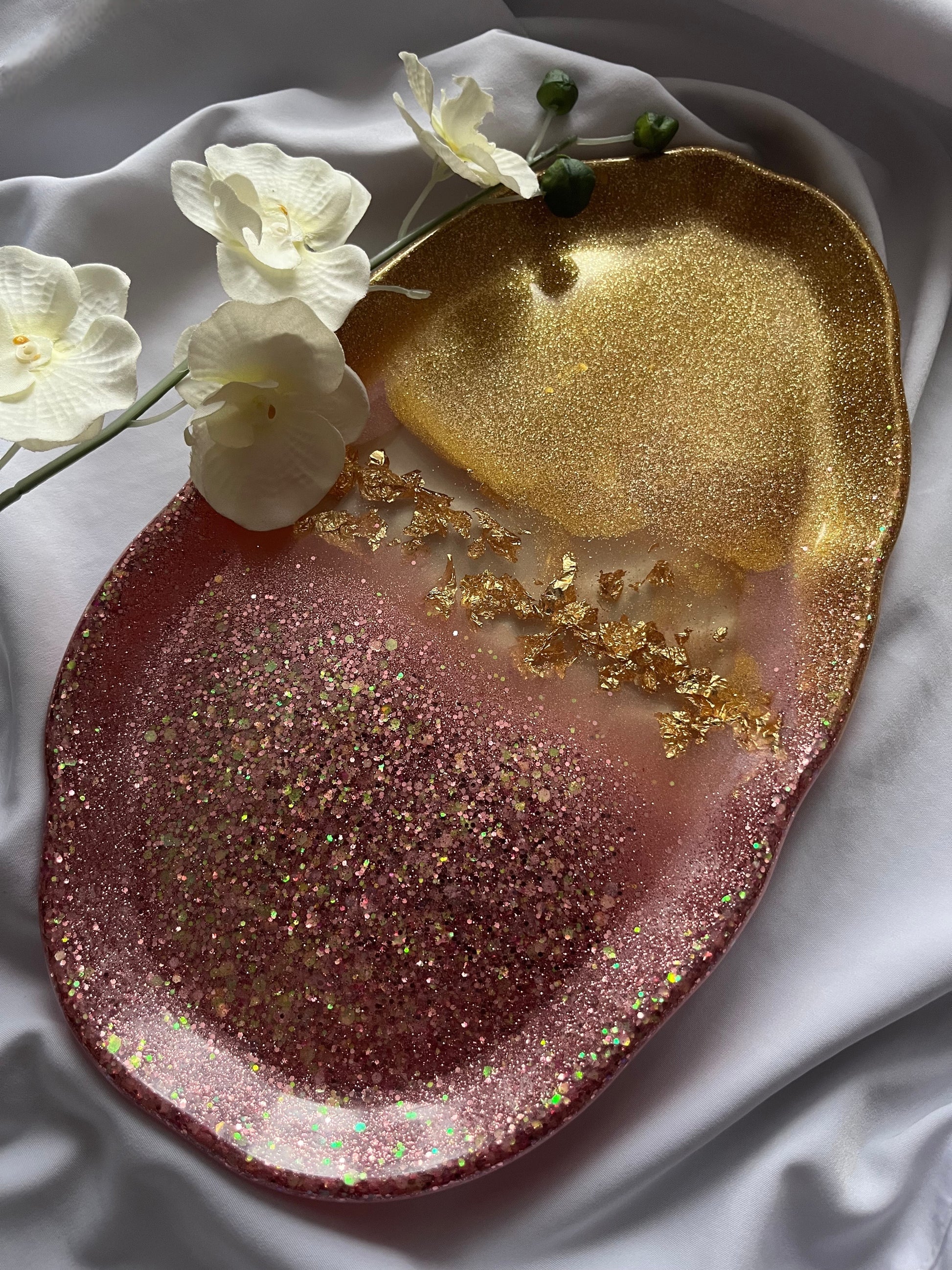 Handcrafted from premium resin, this tray features soft blush tones blended with radiant gold shimmer and delicate gold leaf accents. Its high-gloss finish catches the light beautifully, making it perfect for holding jewellery, candles, keys, or perfumes.