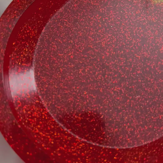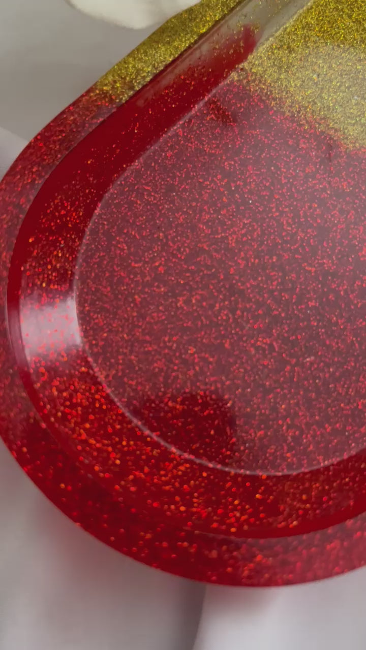 This oval resin tray features a rich red base blended with warm gold tones and finished with sparkling gold glitter. Its smooth, glossy surface and simple shape create a bold yet refined look. Perfect for displaying jewellery, perfumes, candles, or decorative pieces, it adds a touch of luxury and colour to any space.